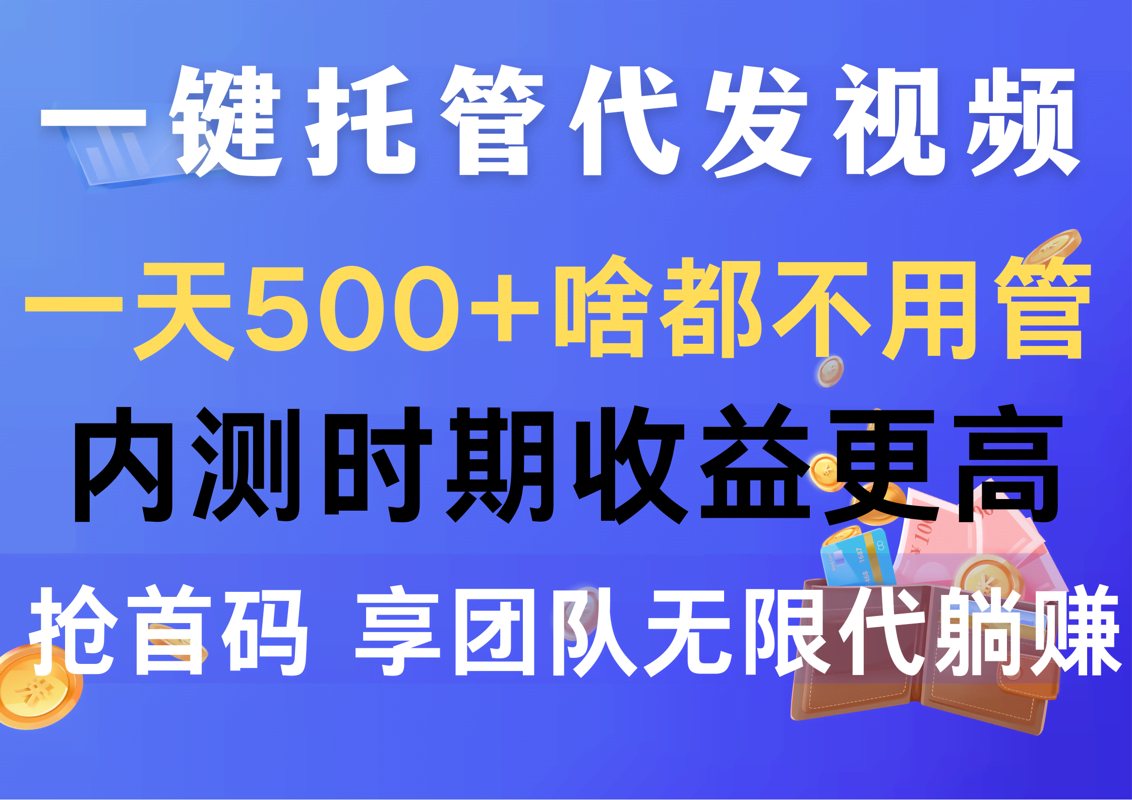 项目原理很简单,我们把抖音号和视频号授权托管给平台,平台免费给我们代发视频(表情包、壁纸类等纯绿色内容),这些视频产生的广告、转化收益,自动分配收益。目前是内测时期,闲时赚板块是试玩游戏赚取佣金板块,目前在内测,后续出来了会有更多玩法。自己玩可以实现躺赚,毕竟账号在你手里拿着也没办法变现,不如代发直接拿收益,有多个账号可以批量绑定(无上限),账号越多收益自然越多,满1元就能提现,24小时到账。有团队推广经验或者想靠这个赚钱的朋友,可以做做推广,管道收益很香,目前是内测阶段,5月5日才正式上线,我们是首批,收益能拿到最高。这是前年无忧赚公司升级的项目,稳定性有保障,可以放心玩,发布的作品自己也能看到。最重要的是免费!!!苹果安卓手机都可以。